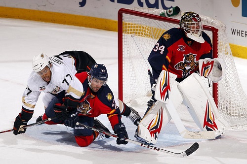 Just over fourteen minutes later, rookie D-man Hampus Lindholm proved his worth in doubling the Ducks’ early lead. Spurred by an outstanding individual effort, Lindholm drove hard to the Panthers’ cage, nearly rounding Cats defenseman Campbell to fire a point-blank shot on net. Following a timely poke-check, the puck bounced around the boards to Emerson Etem, who pinned the puck along the boards until help arrived, in the form of Nick Bonino. Lindholm-patrolling the blue-line relatively unchallenged-stepped into a wrister following Bonino’s cross-ice feed that beat Thomas high glove-side.