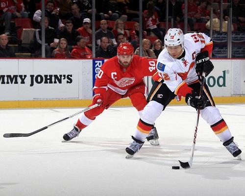 DETROIT, MI – FEBRUARY 05: Jarome Iginla #12 of the Calgary Flames skates with the puck as Henrik Zetterberg #40 of the Detroit Red Wings gives chase during a NHL game at Joe Louis Arena on February 5, 2013 in Detroit, Michigan. (Photo by Dave Reginek/NHLI via Getty Images)