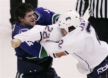 Jean-Francois Jacques (22) misses with a right hand while fighting Vancouver Canucks’ Mike Brown during the second period of pre-season NHL action in Vancouver, Canada, Thursday, September 20, 2007.