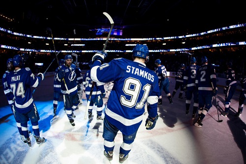 Steven Stamkos #91 and the Tampa Bay Lightning celebrate after defeating the Buffalo Sabres 2-1 at the Tampa Bay Times Forum on March 26, 2013 in Tampa, Florida. Stamkos scored his league-leading 23rd goal of the season in the victory.