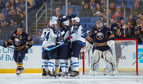 Bryan Little #18 of the Winnipeg Jets celebrates his first period goal against Ryan Miller #30 of the Buffalo Sabres with teammates.