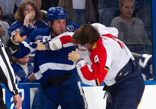 TAMPA, FL – JANUARY 29: B.J. Crombeen #19 of the Tampa Bay Lightning fights Keaton Ellerby #4 of the Florida Panthers at the Tampa Bay Times Forum on January 29, 2013 in Tampa, Florida.