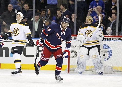 The Rangers wasted no time getting on the board. 4:36 in to the 1st period, Gaborik scored his first goal of the season on a beautiful feed from winger Rick Nash. Just 2:13 later, the Slovakian Sniper lit the lamp again – this time on a rebound off of a Michael Del Zotto shot. The Rangers won the 1st period, but Boston wasted no time clawing their way back in the game in the 2nd. An early Marc Staal slashing penalty led to a Brad Marchand power play goal to cut the lead to 1. A ticky-tack tripping call on Taylor Pyatt soon after allowed the Bruins to steal the momentum and keep the Rangers on the defensive. At the 12:24 mark, Milan Lucic put back a rebound left by Henrik Lundqvist to tie the game. The momentum shift didn’t last long, as Taylor Pyatt put the Rangers back in front just 44 seconds later with a backhand shot from the slot.