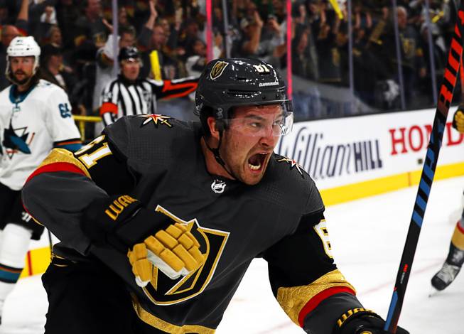 Stone after scoring a hat-trick in game 3 of the Sharks/Knights series. Expect a lot more of this next season. Photo: Steve Marcus/ Las Vegas Sun