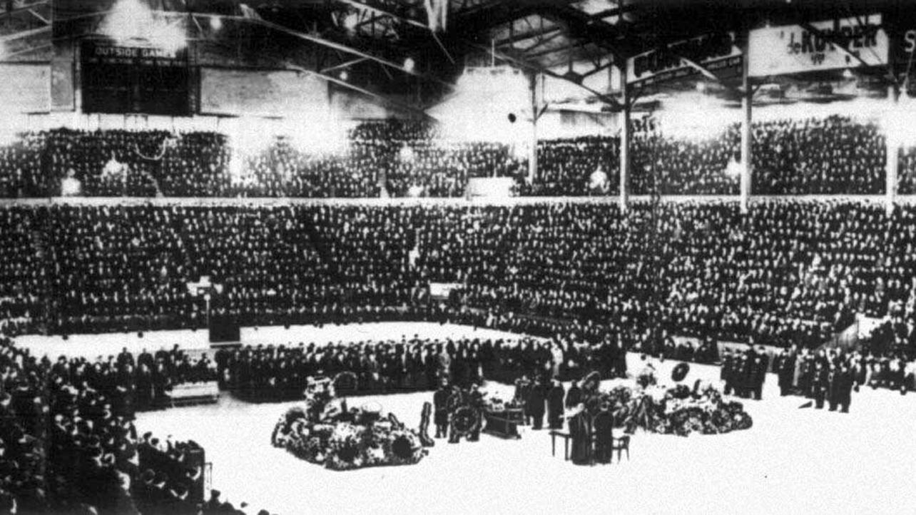 The Montreal Forum packed with mourning teammates, family, friends, and fans of Howie Morenz.