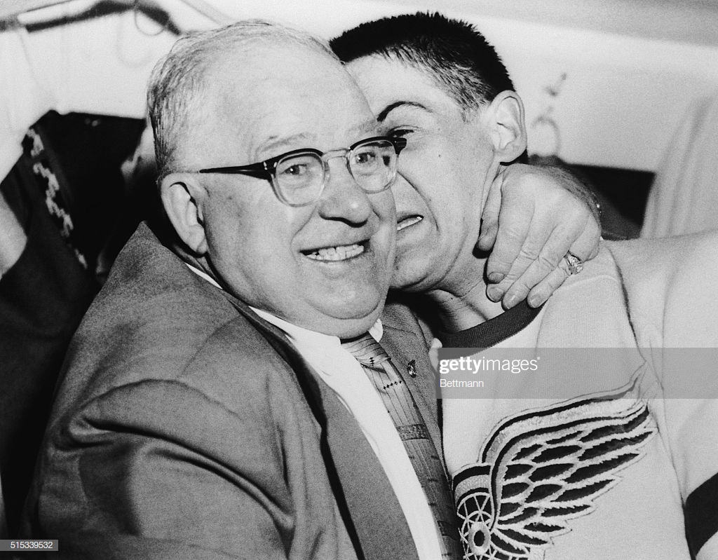 Red Wings’ General Manager Jack Adams (left) gives Detroit goalie Terry Sawchuck a hug after the player shut out the Montreal Canadiens 6-0, giving the Red Wings the national Hockey League championship. Sawchuck also won the Vezina Award. Photo: Getty Images