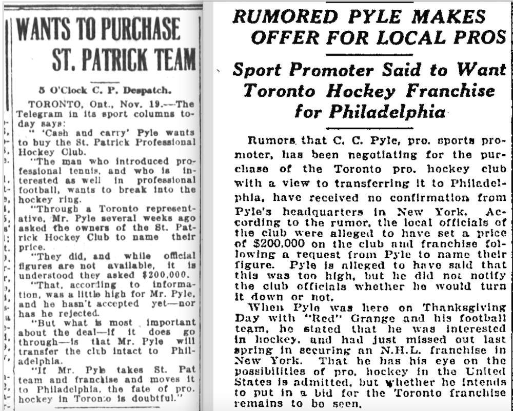 He had recently lost out to the Rangers bid for a franchise in New York and wanted to get into the NHL. Pyle had visited Toronto in the fall of 1926 and saw the team play, which furthered his love for hockey and cemented his intentions to buy the team. He was almost willing to pay anything for it so he wouldn’t lose out on another chance to have his own franchise.