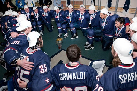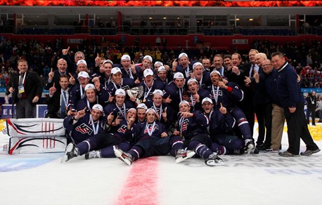 Team USA players and staff celebrate with the championship trophy following a gold medal win over Sweden at the 2013 IIHF Ice Hockey U20 World Championship.