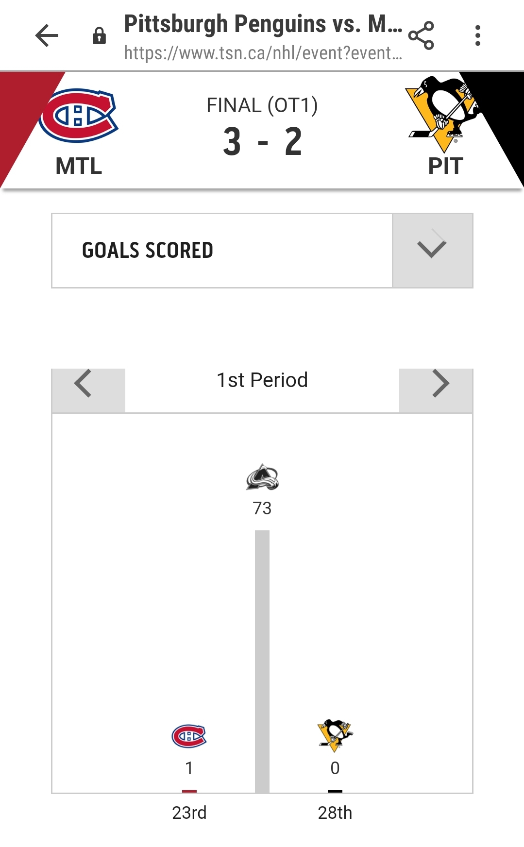 -Also, while researching this game TSN showed that Montreal scored one goal in the first, Pittsburgh didn’t score in the first – but the surprise was that the Colorado Avalanche (who didn’t play in this game) scoring an astounding 73 goals in the first period. TSN needs to check their app before they wreck their app.