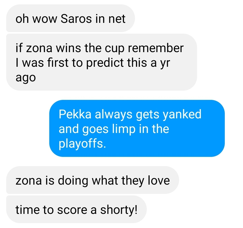 -Before the game the fearless leader of this site, Igor, and myself made a couple of predictions. I humorously predicted Phil “The Thrill” Kessel would score 75 goals in this series. Igor took it a bit more seriously and said the Coyotes, would score a shorthanded goal. If you need proof you can see this super serious exchange we had at puck drop:
